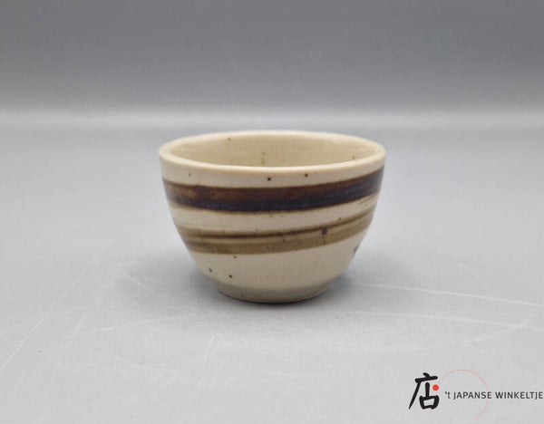 Een aards gekleurde sake set, bestaande uit 1 karaf en 4 kopjes.