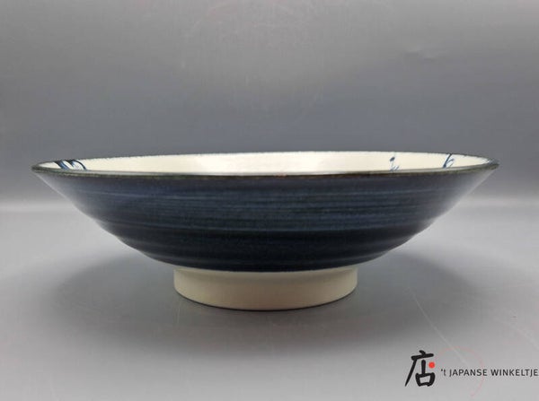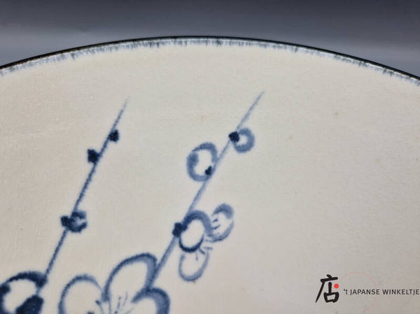 Een grote wit/blauwe schaal met een pruimenbloesem afgebeeld aan de binnenkant. Perfect om te gebruiken voor soep of als fruitschaal.