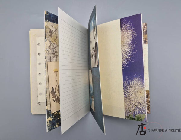 Een A5 formaat geillustreerd schrift met een mix van gelinieerde pagina's en (bekende) illustraties uit de Japanse kunstwereld.