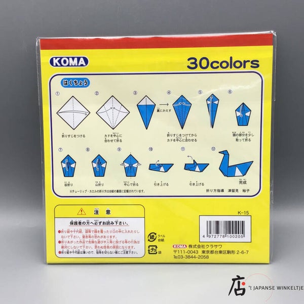 Er zitten 30 vel met 30 verschillende kleuren in dit setje. Het papier is enkelzijdig gekleurd. Bijgevoegd is een instructiepagina om 3 modellen te vouwen: een tulp, een zwaan en een kikker.