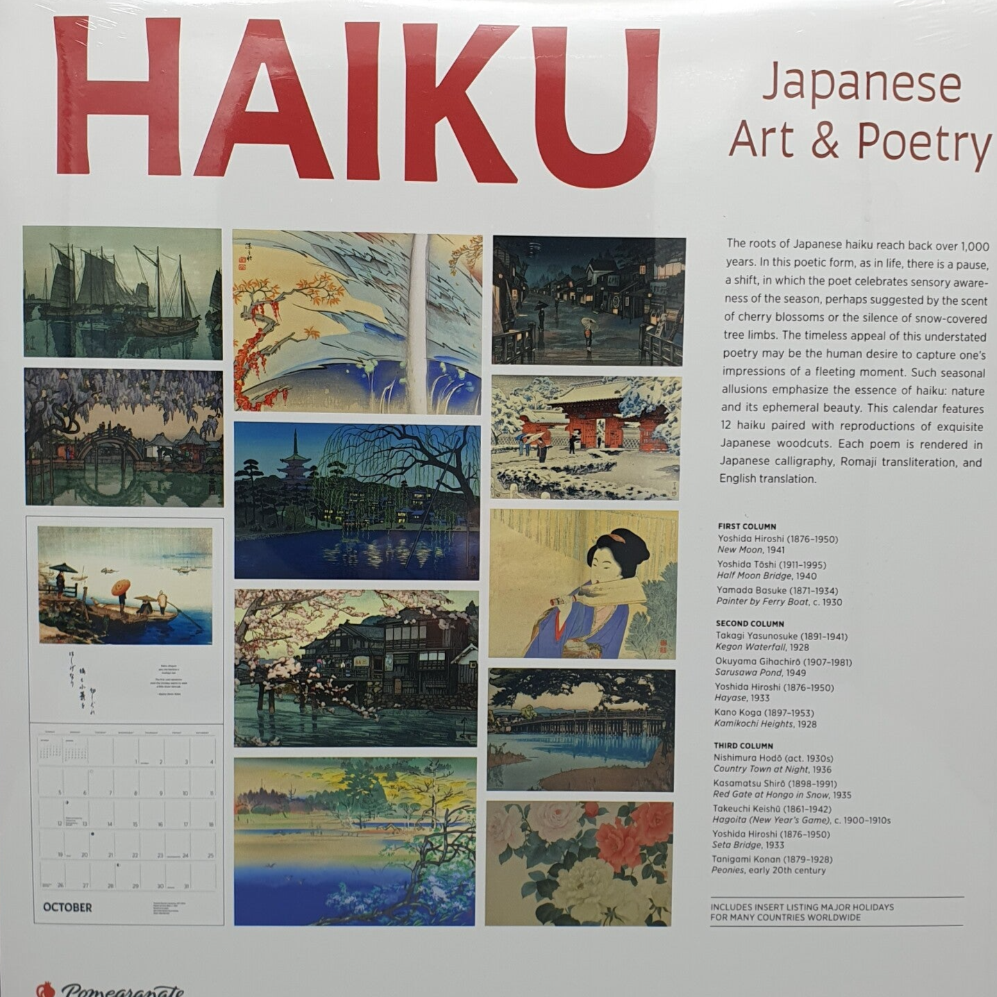 Kalender met verschillende houtblokprenten en haiku's (Japans gedicht).