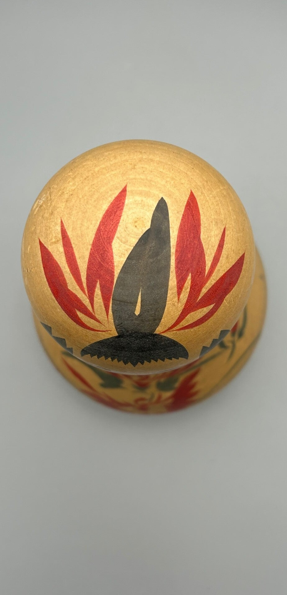 Zeer grote kokeshi met groene en rode tinten. Unieke vorm.