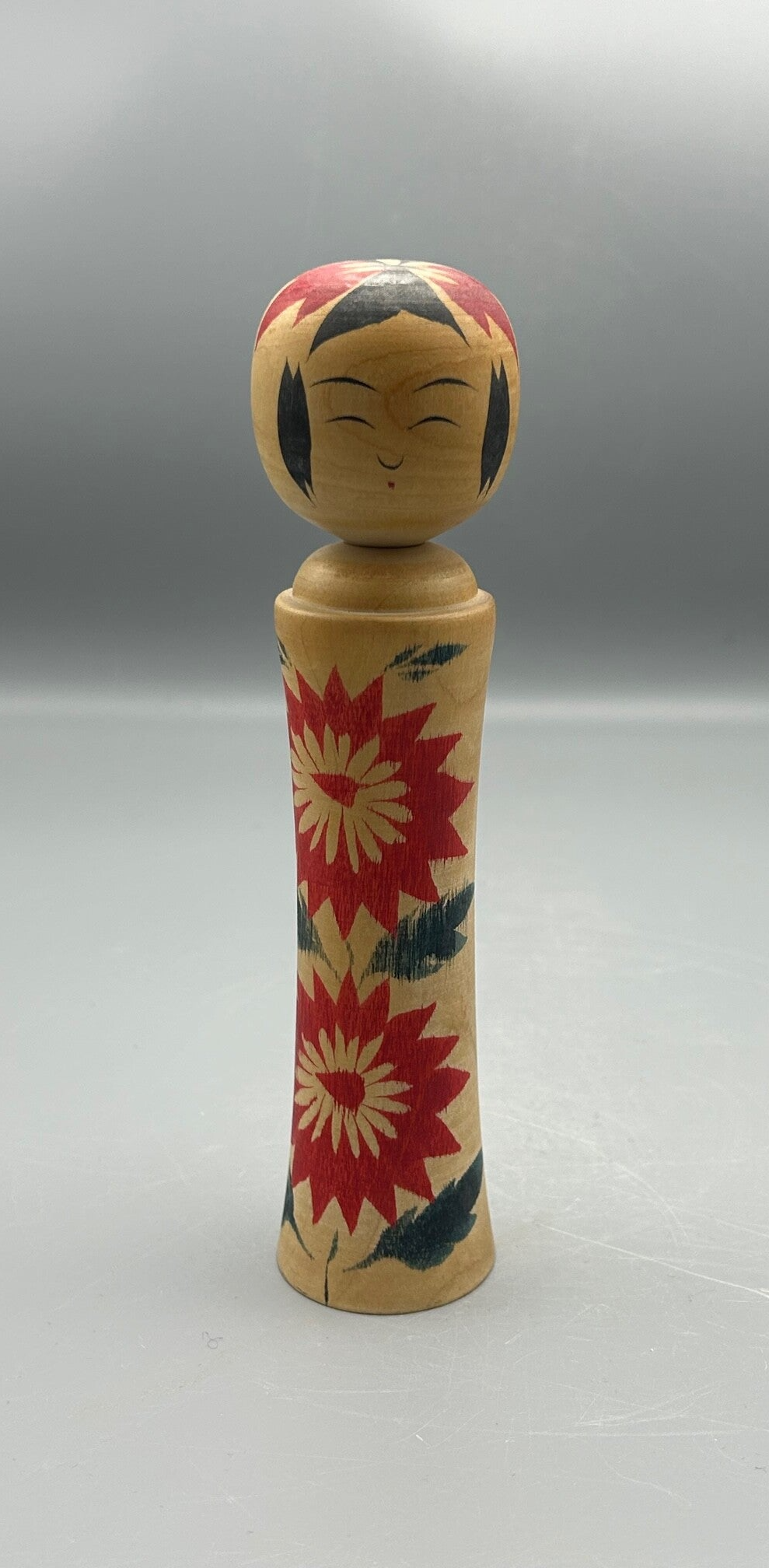 Prachtige kokeshi met groene en rode tinten. Leuk gezichtje.