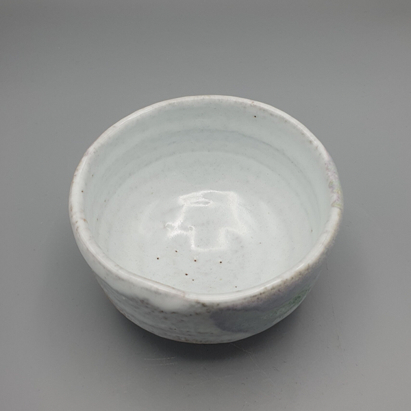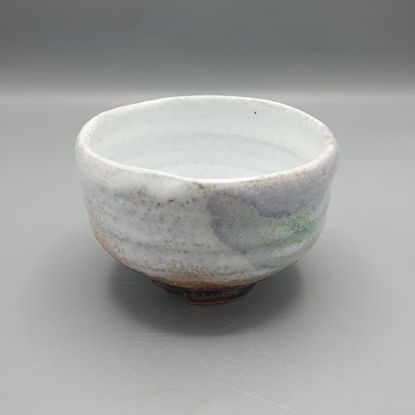 Mooie Hagi yaki matcha kom van de hand Seigan Yamane. Let op de mooie groene en paarse pasteltinten op de zijkant.