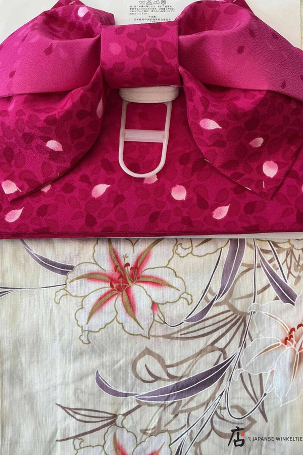 Met een strik die gemakkelijk aan en af te doen is van de brede ceintuur (obi)