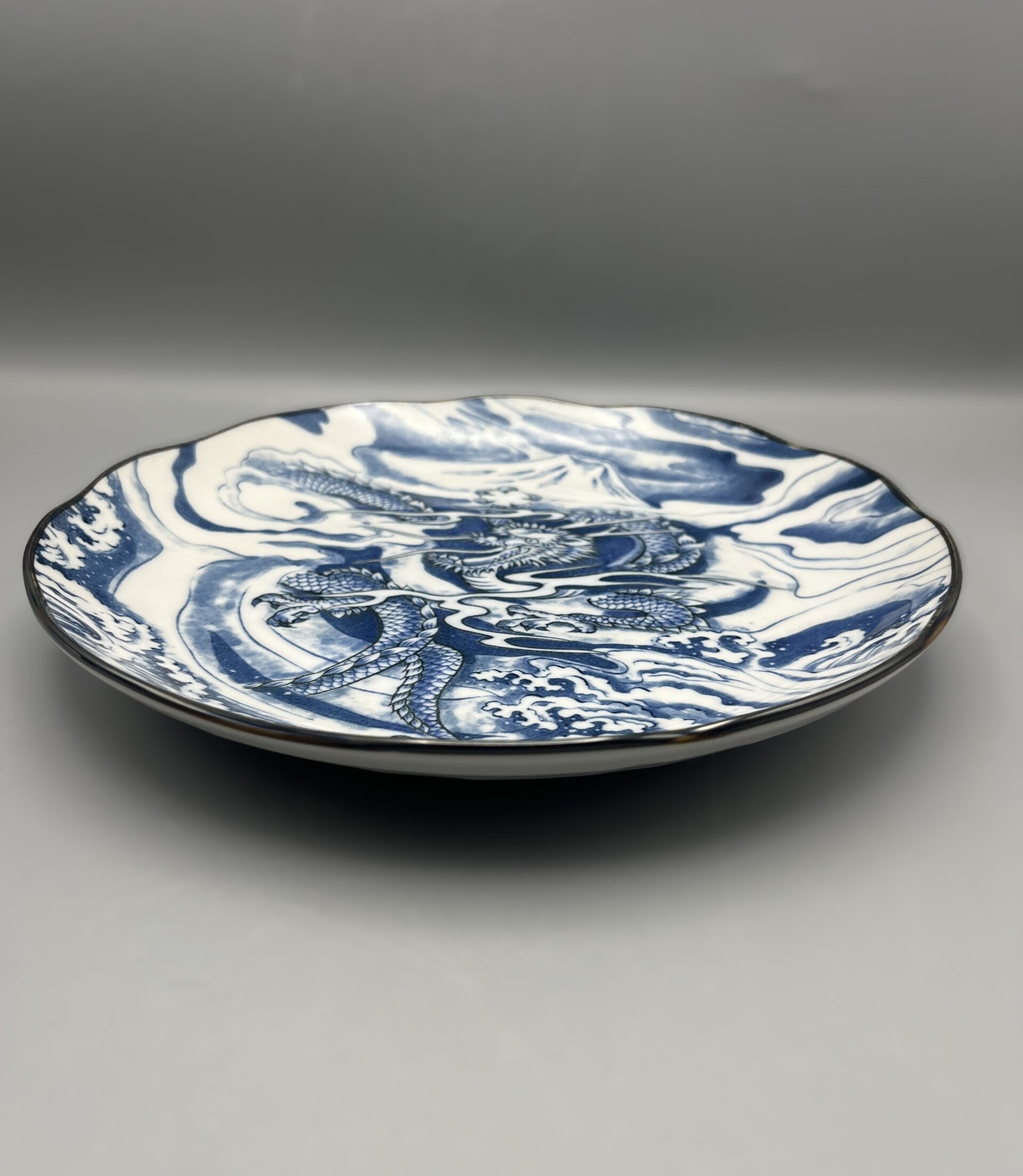 Keramieken schaal met draakmotief in wit en blauw.