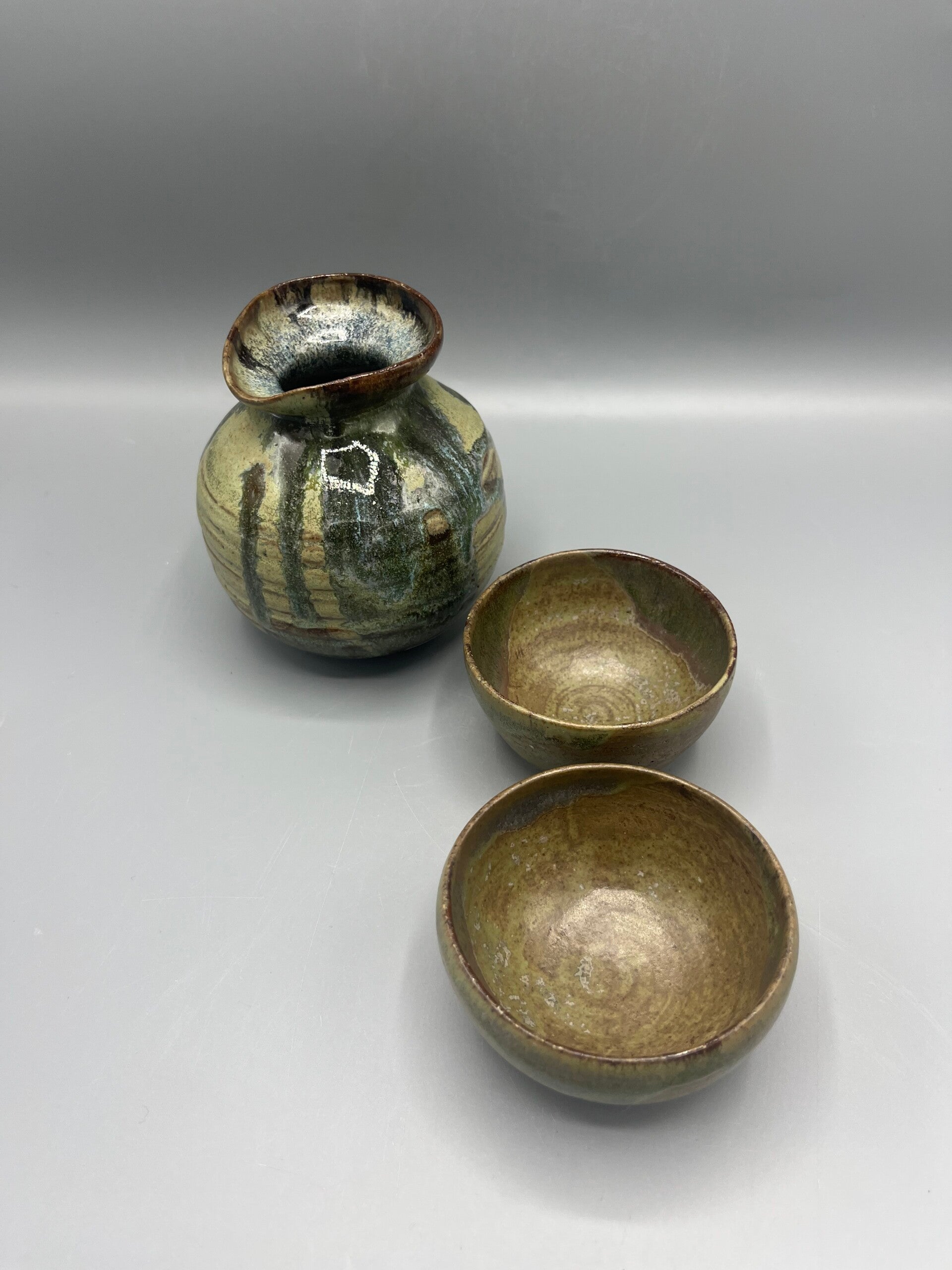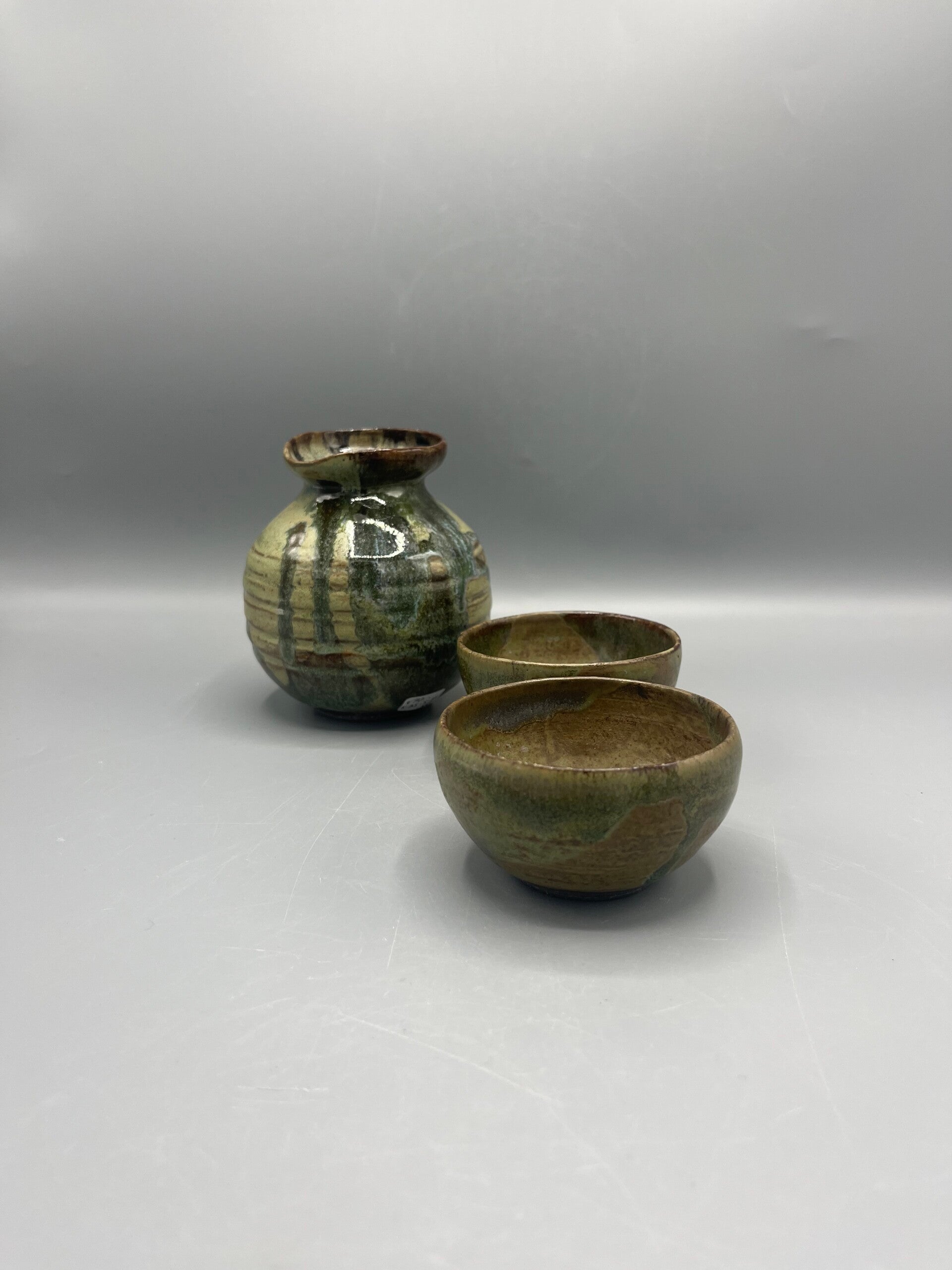 Sake set bestaande uit 1 karaf en 2 kopjes. De karaf en kopjes zijn licht groen, bruin en donkergroen van kleur en zijn met zorg handgemakt door pottenbakster Anne Sey.