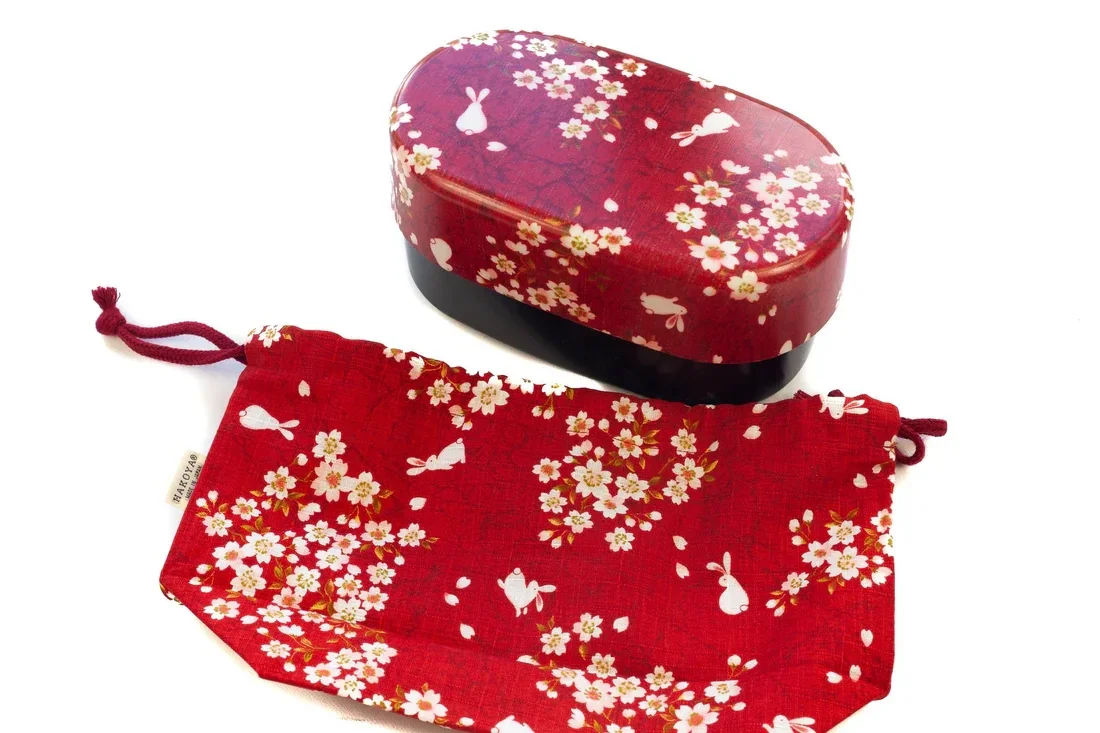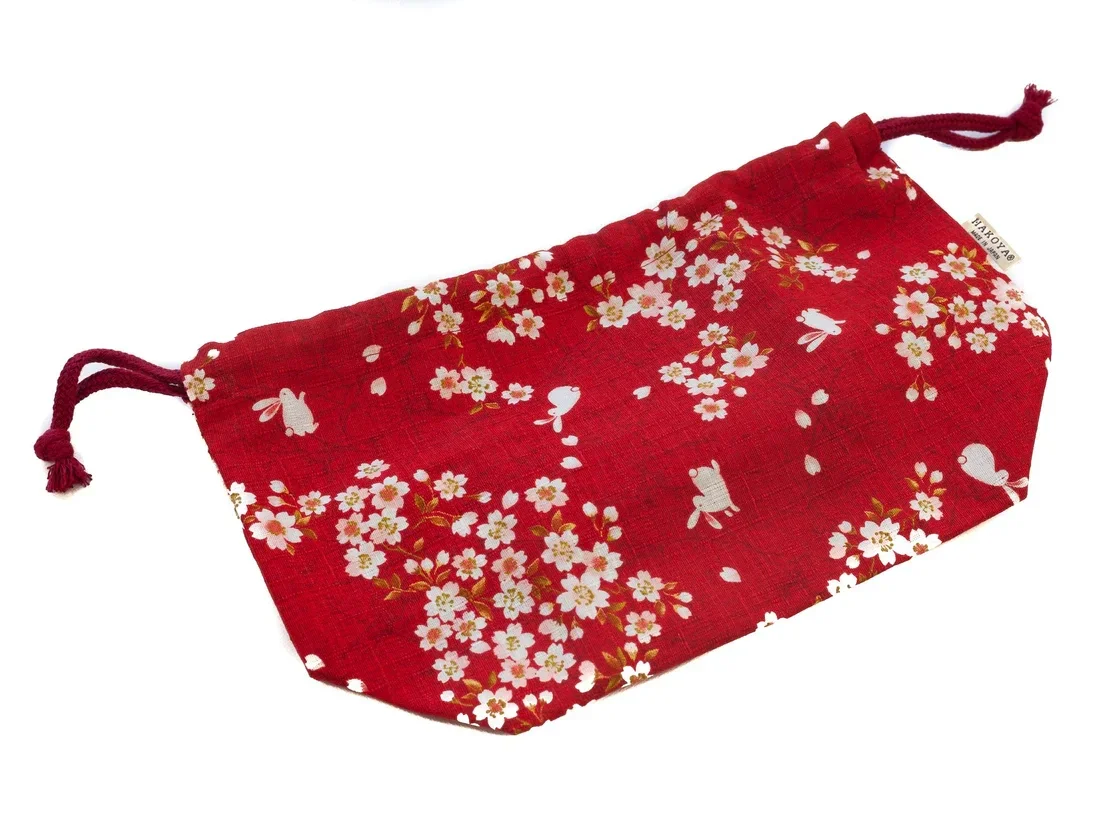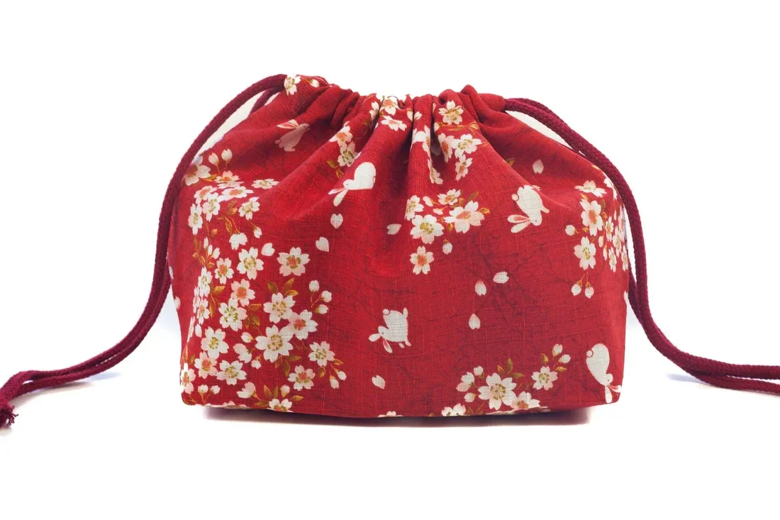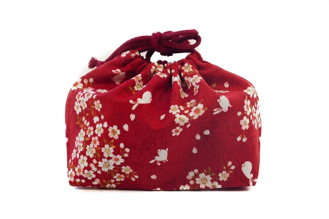 Een handig tasje om je bento in te bewaren. De kleur is rood met moteiven van sakura.