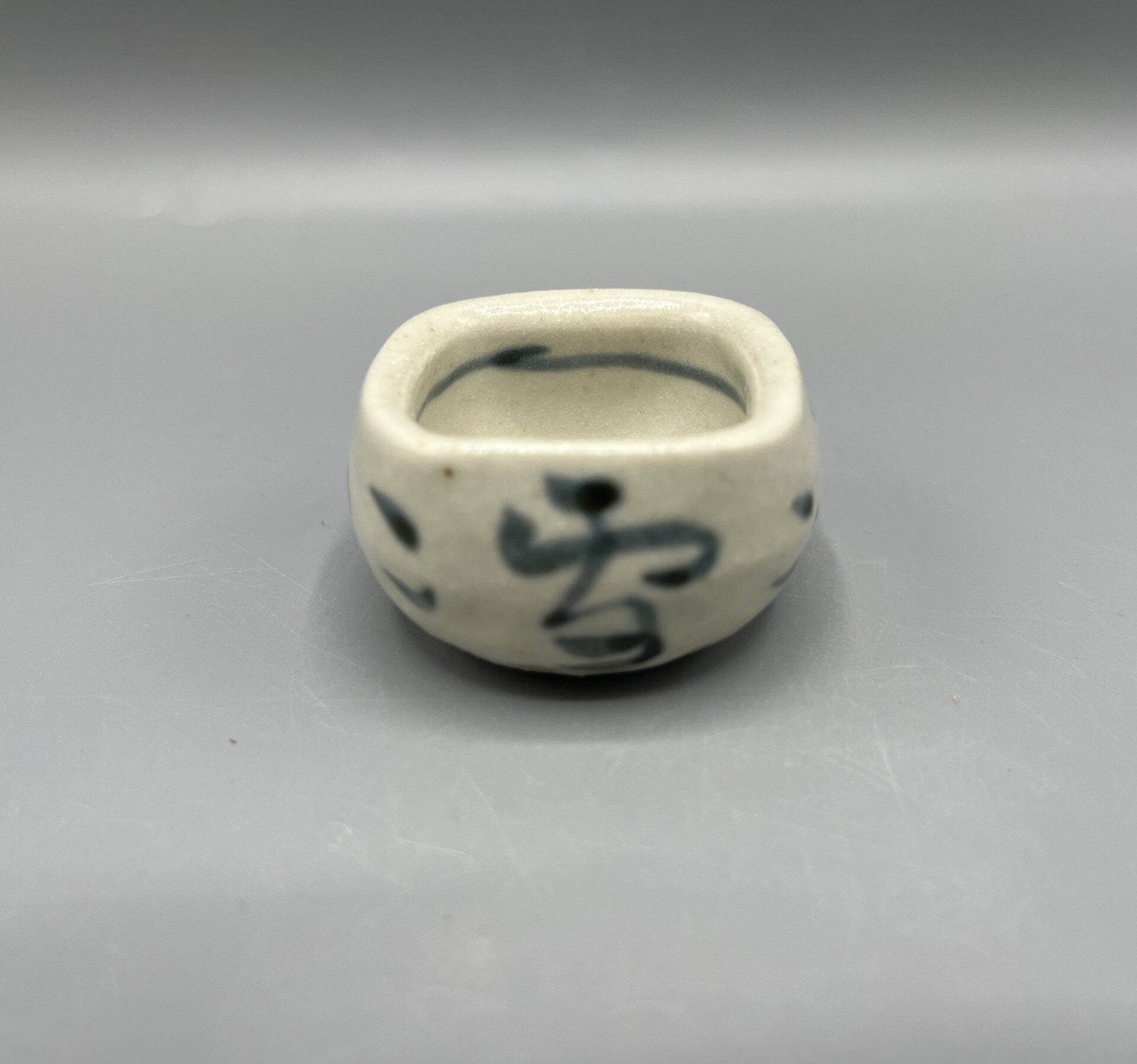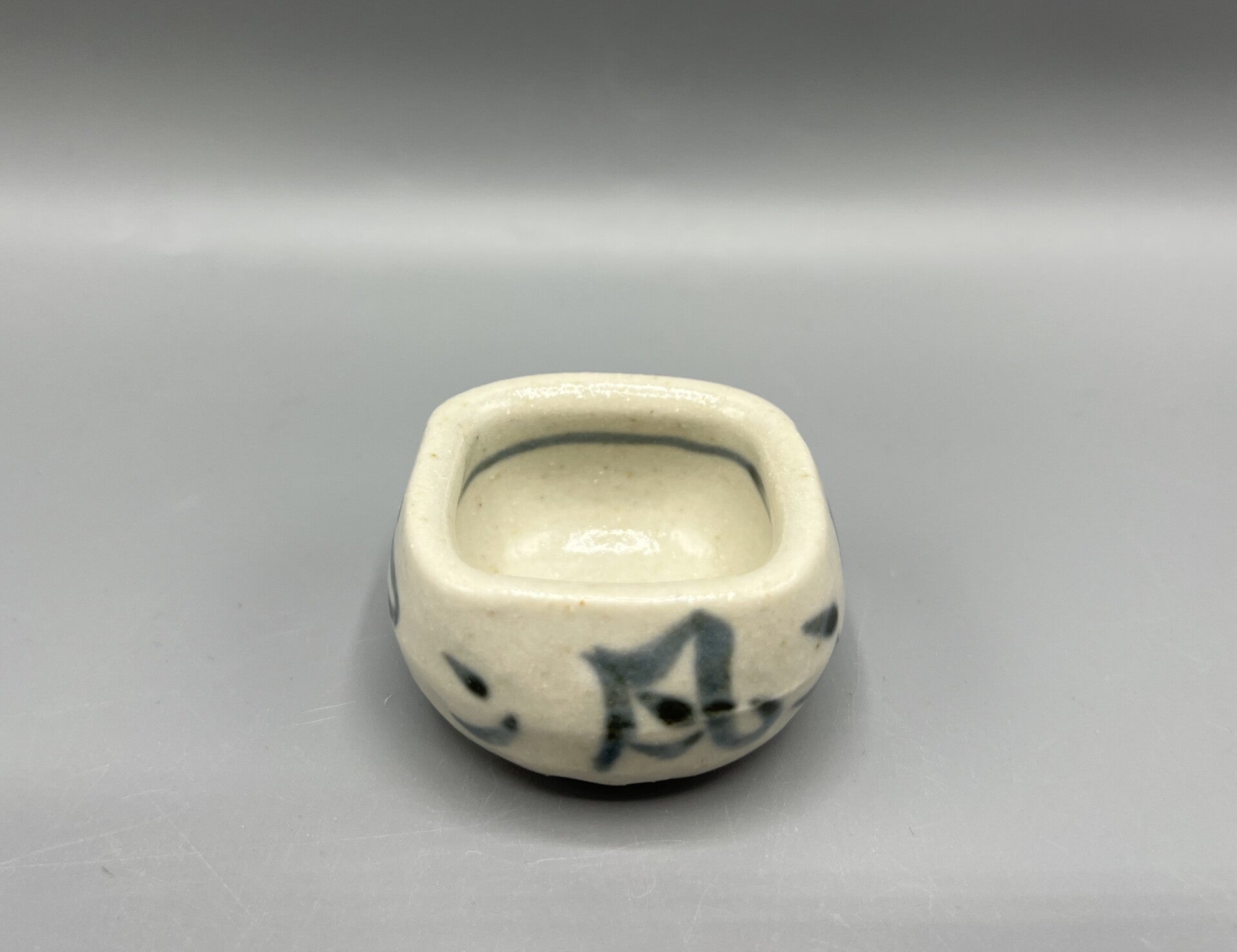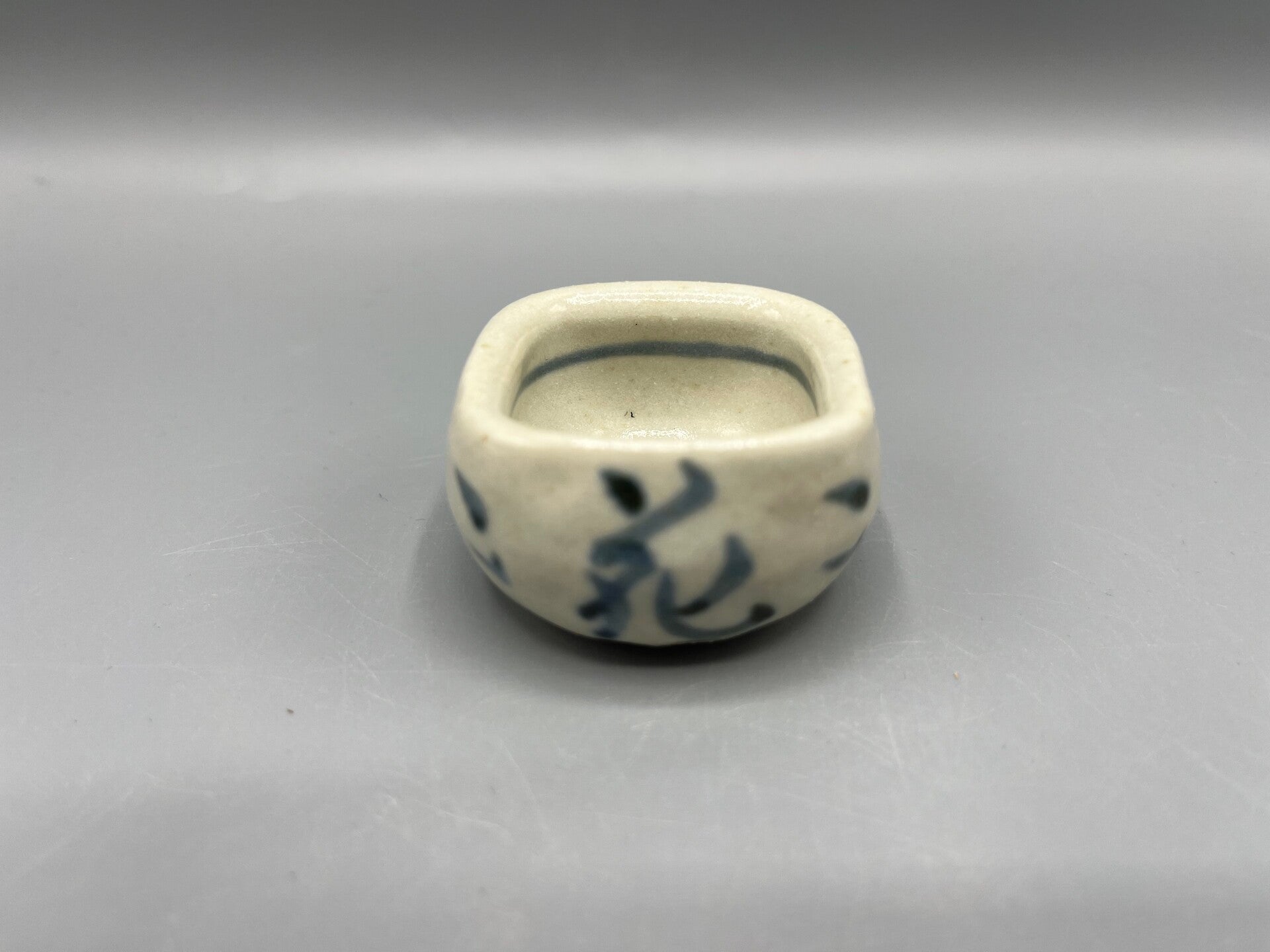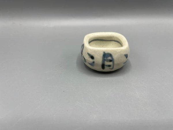Klein schaaltje met blauwe karakters op een witte achtergrond.