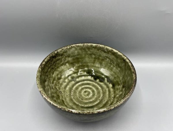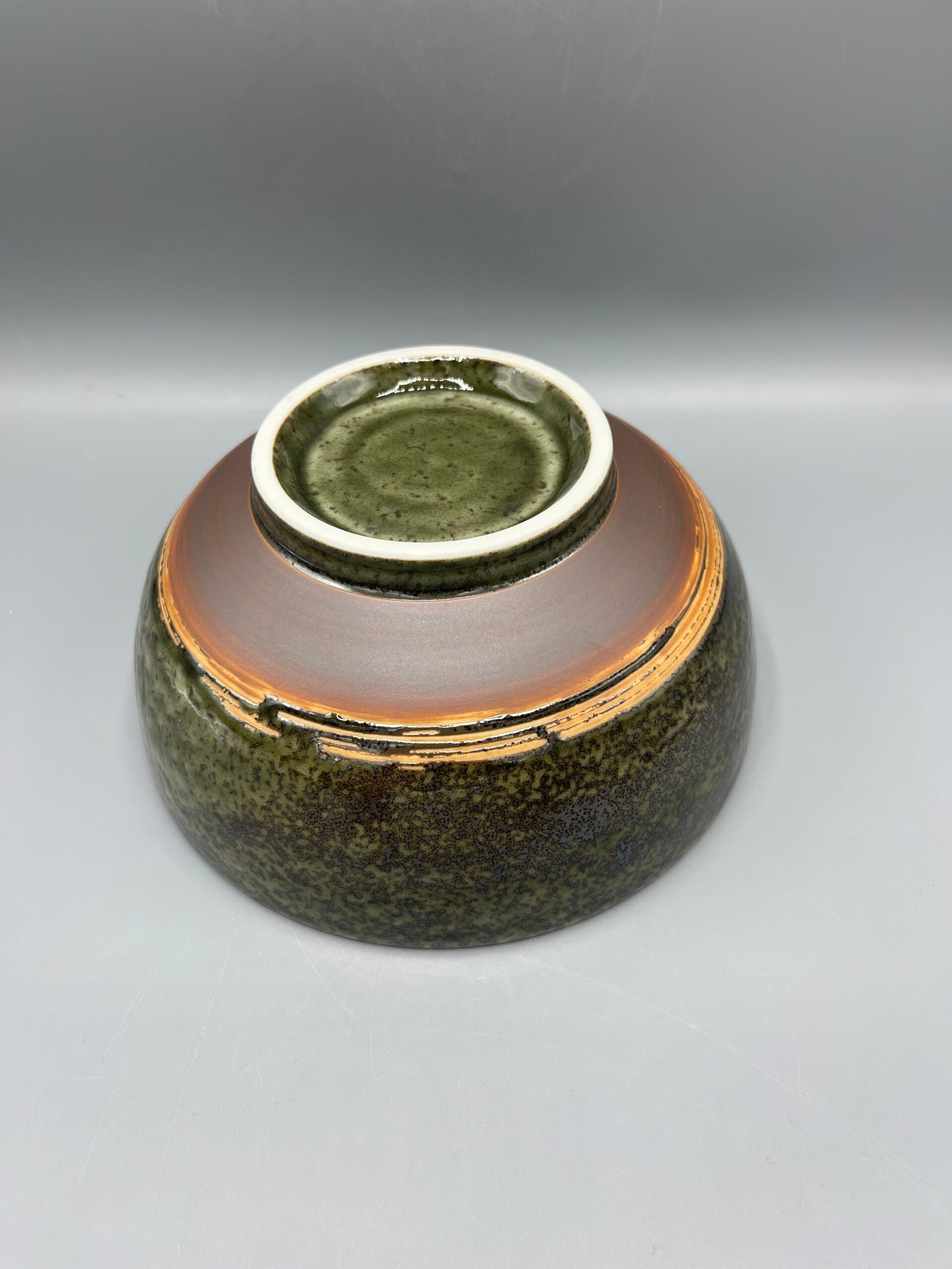 Grijsgroen kom met bruine vlekjes.