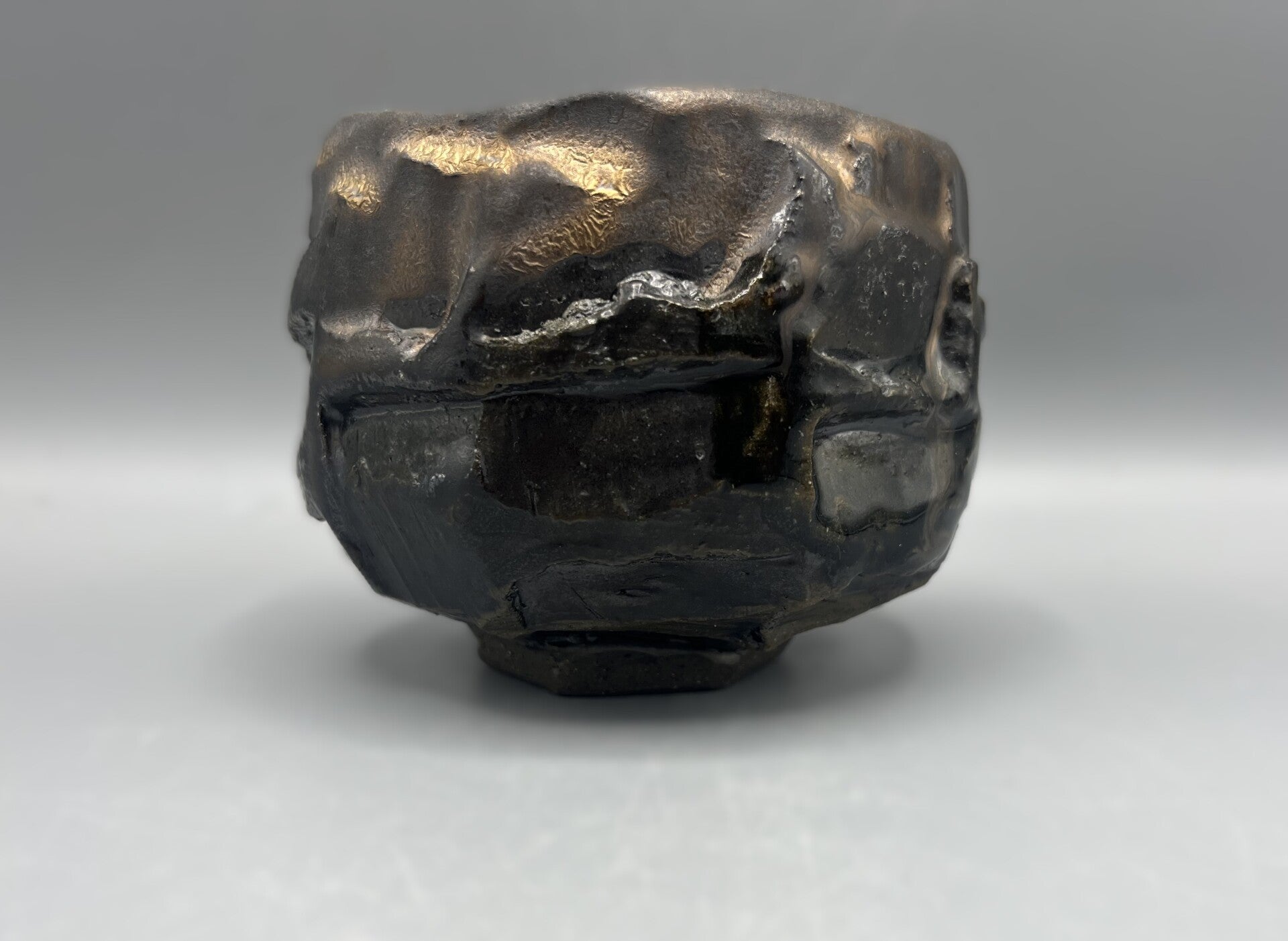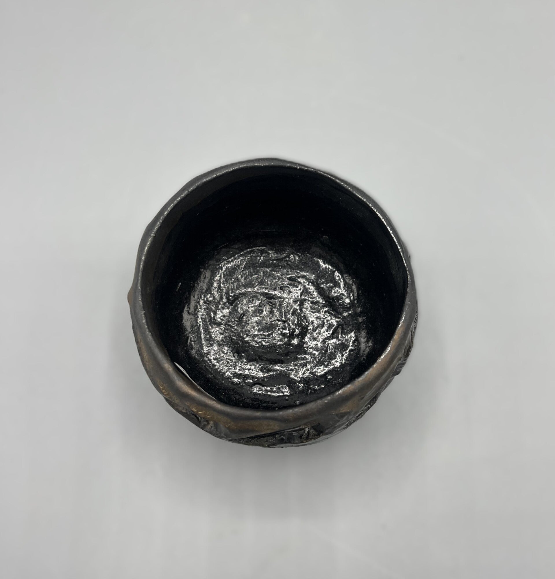 Gestructureerde beker in zwart met bronstinten, handgemaakt door Anne Sey.