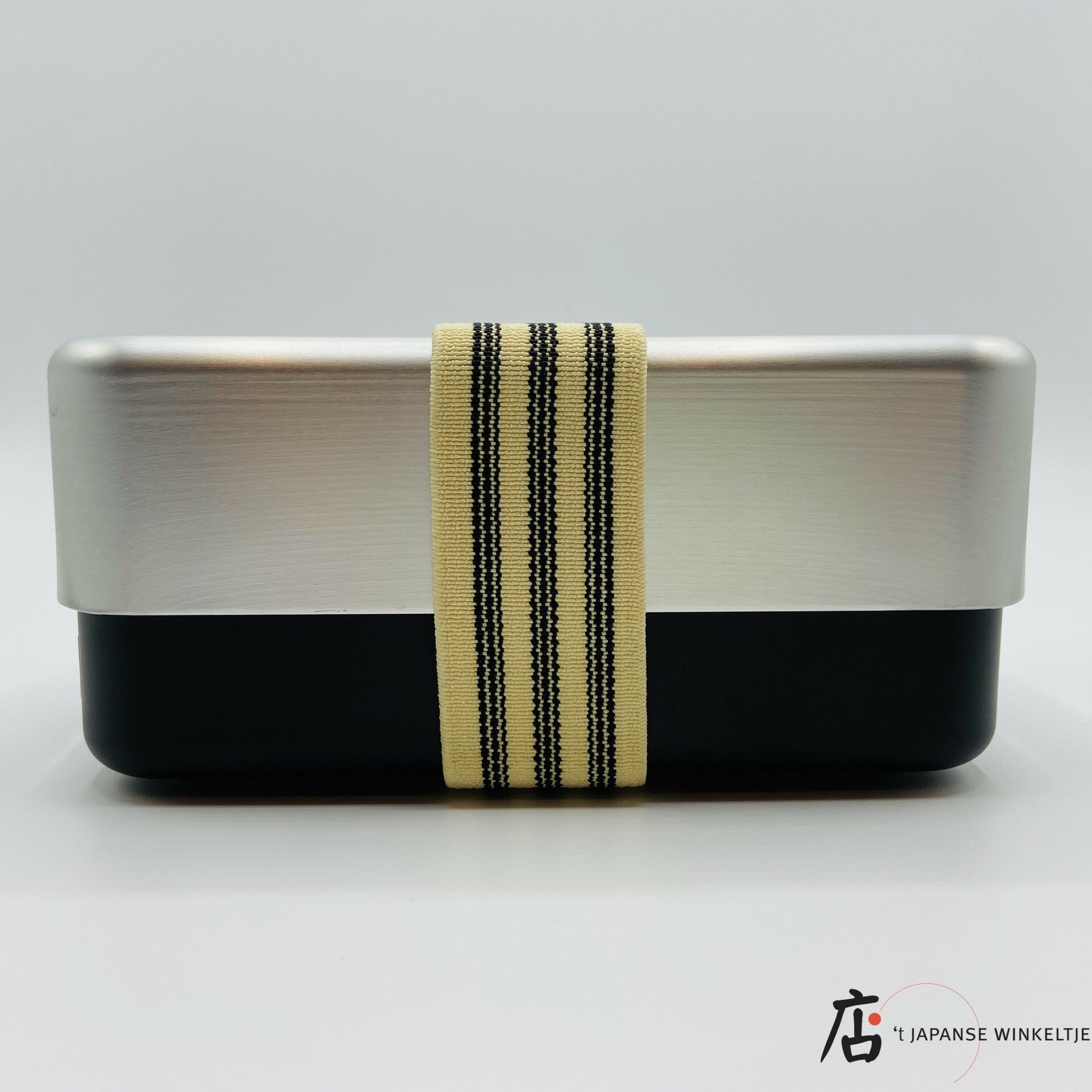 Rechthoekige lunchbox met zilverkleurig deksel, incl. prachtige band.