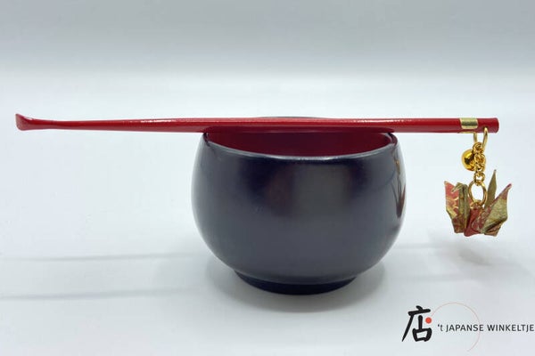 Houten mimikaki met goudkleurig hangertje met belletje en kraanvogel (van gelakt papier).