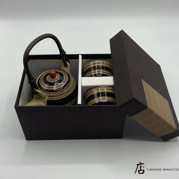 Thee set zwart/beige/rood gestreept voor 2 personen (K-Sai-55464)