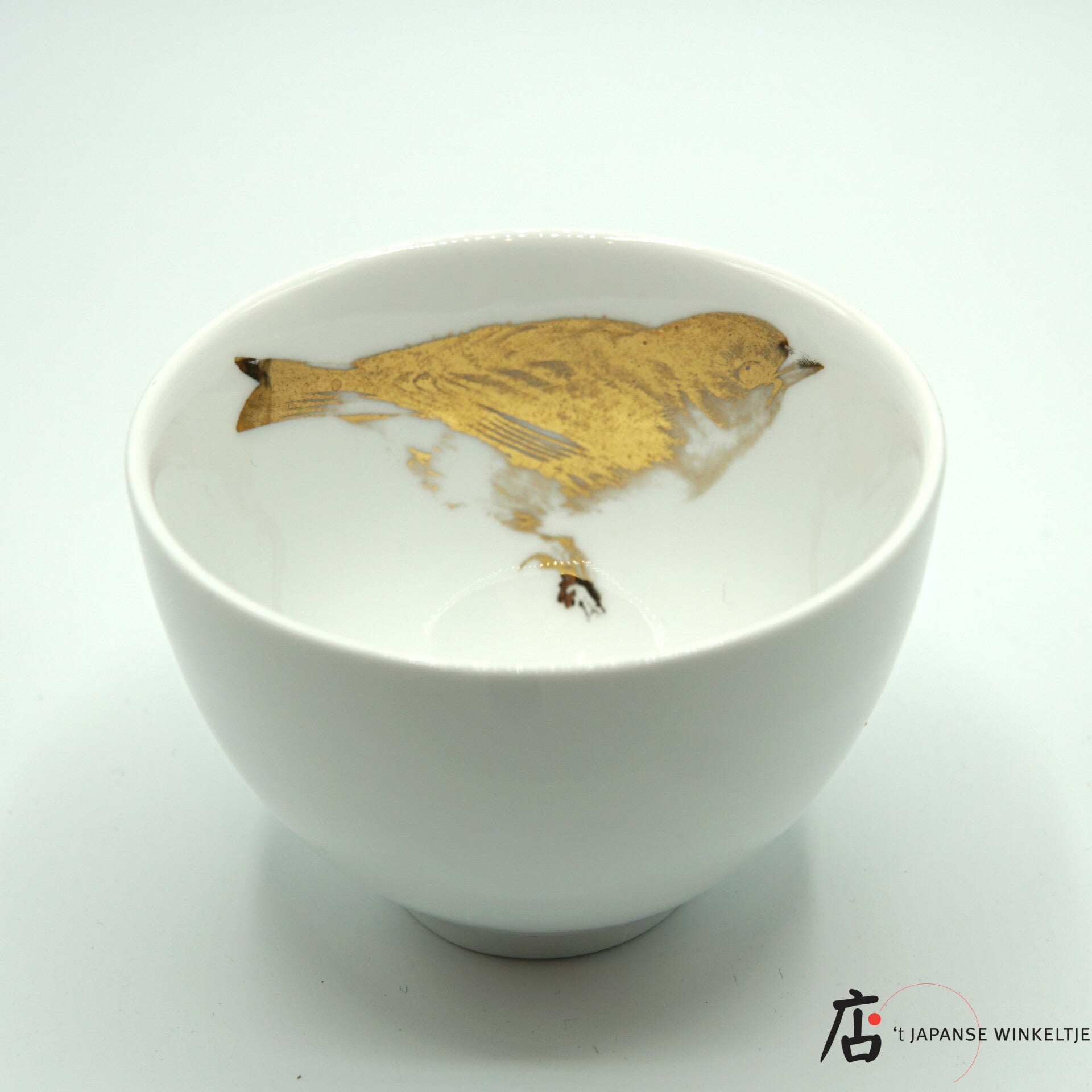Theekom gedecoreerd en voorzien van een gedicht door Haruka Matsuo. Iedere kom is verschillend en heeft een ander motief van vogels en bladeren.