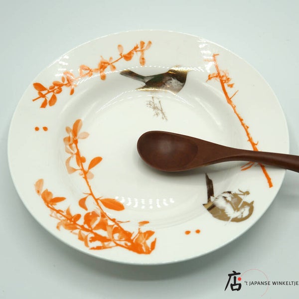 Bord gedecoreerd door Haruka Matsuo. Ieder bord is verschillend en heeft een ander motief van vogels en bladeren.