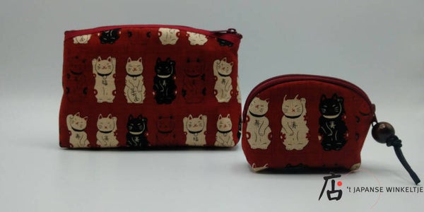 Kleine etui voor bijvoorbeeld kleingeld met opdruk maneki neko, oftewel de wenkende kat of gelukskat.