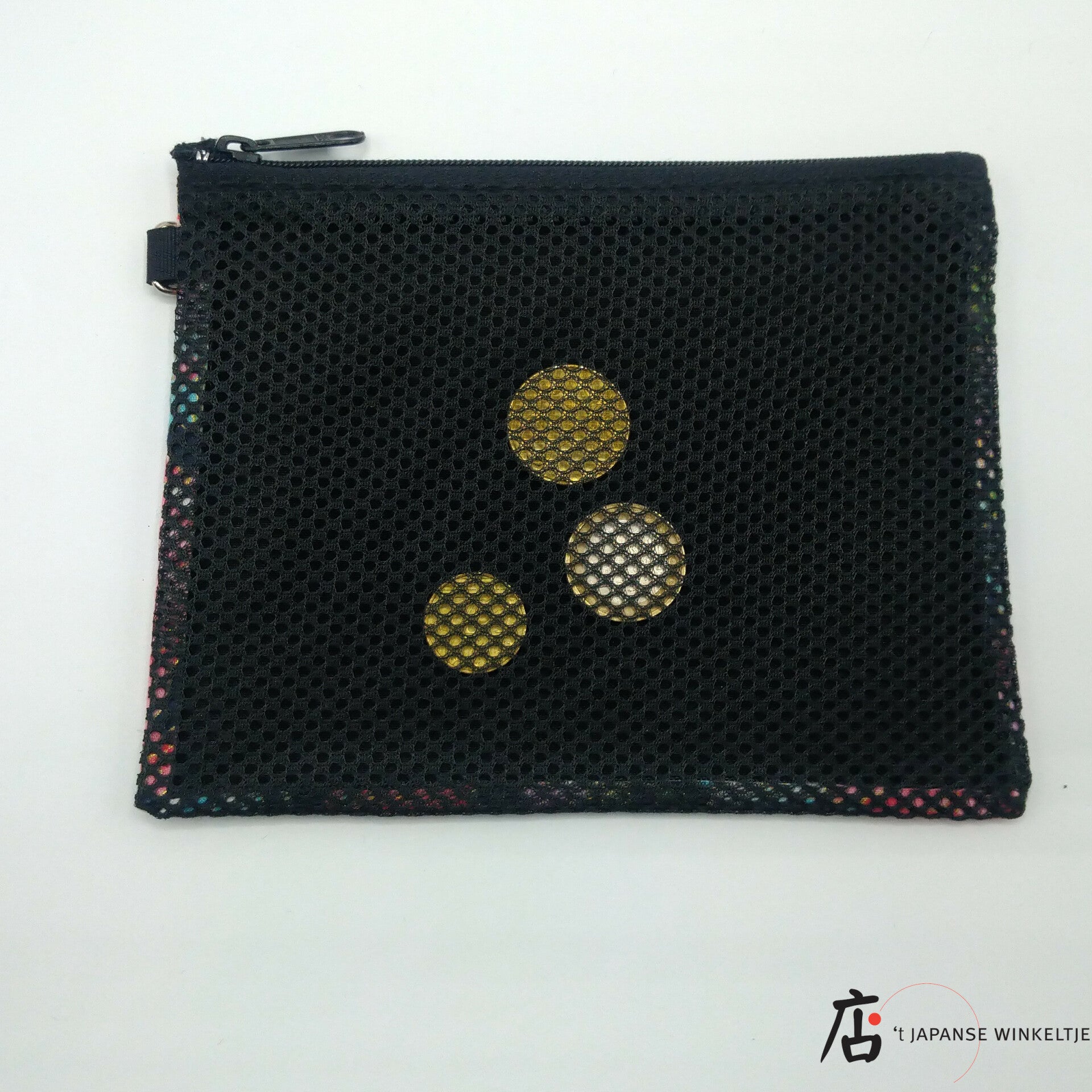 Opbergtasje met rits. De achterkant is van gaas gemaakt, waardoor je in 1 oogopslag ziet wat er in het tasje zit. Aan het tasje zit een klein ringetje bevestigd, waardoor je het tasje kunt vastmaken aan de binnenkant van je handtas.
