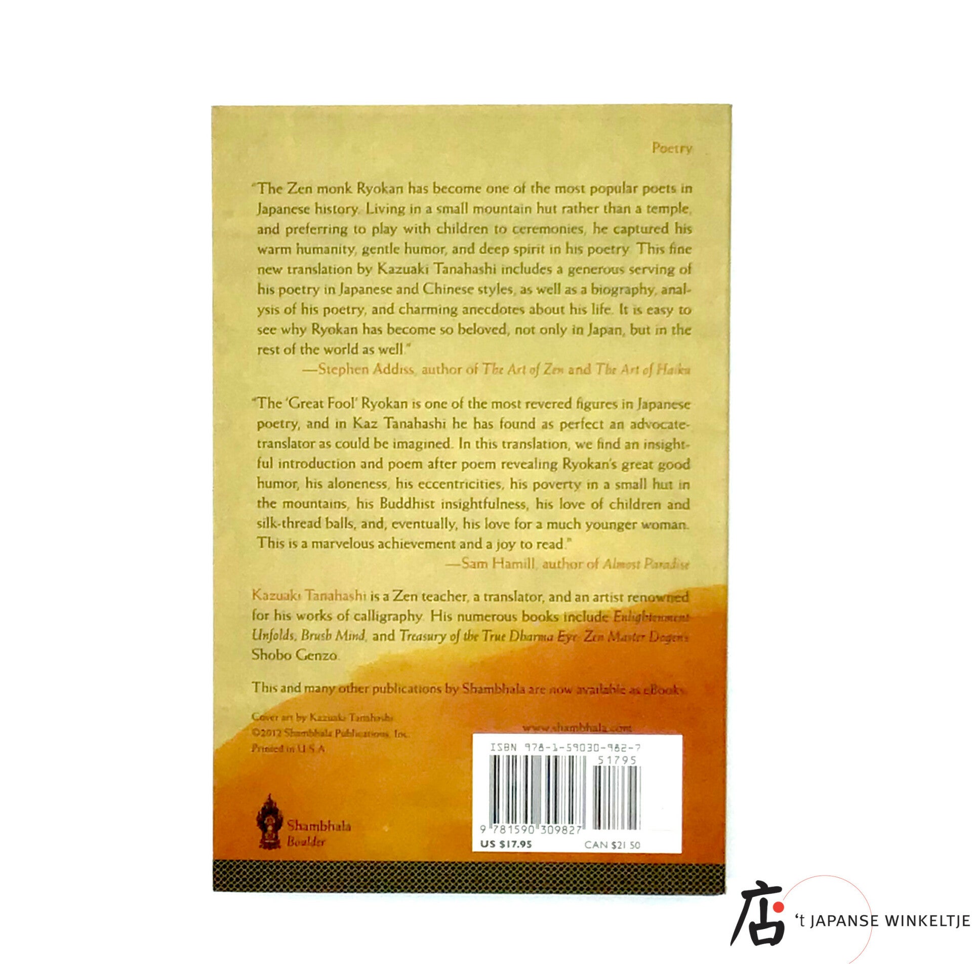 De zen monnik Ryokan (1758-1831) is zeer geliefd als dichter in de Japanse geschiedenis. Dankzij de vertalingen naar het Engels van auteur Kazuaki Tanahashi is het nu mogelijk voor de Westerse wereld om kennis te maken met het werk van Ryokan.