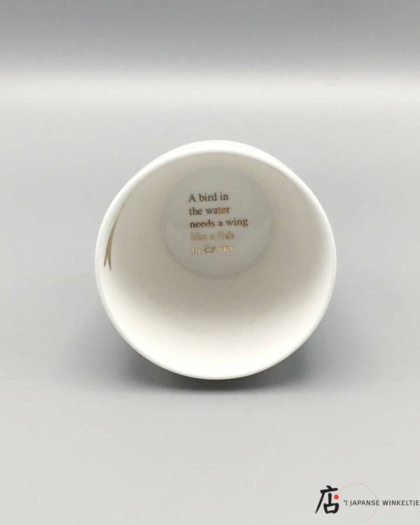 Beker gedecoreerd en voorzien van een gedicht door Haruka Matsuo. Iedere beker is verschillend en heeft een ander motief van vogels en bladeren.