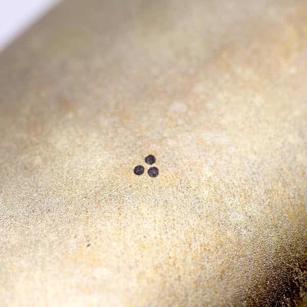 Grote handgemaakte messing theeschep ingelegd met zilver. Te gebruiken bij de theeceremonie (sencha do). Het messing is met vuur gepatineerd waardoor iedere schep weer anders is. Het patroon is afgeleid van een antiek Ise-Katagami stencil, voorheen gebruikt voor het verven van kimono’s.