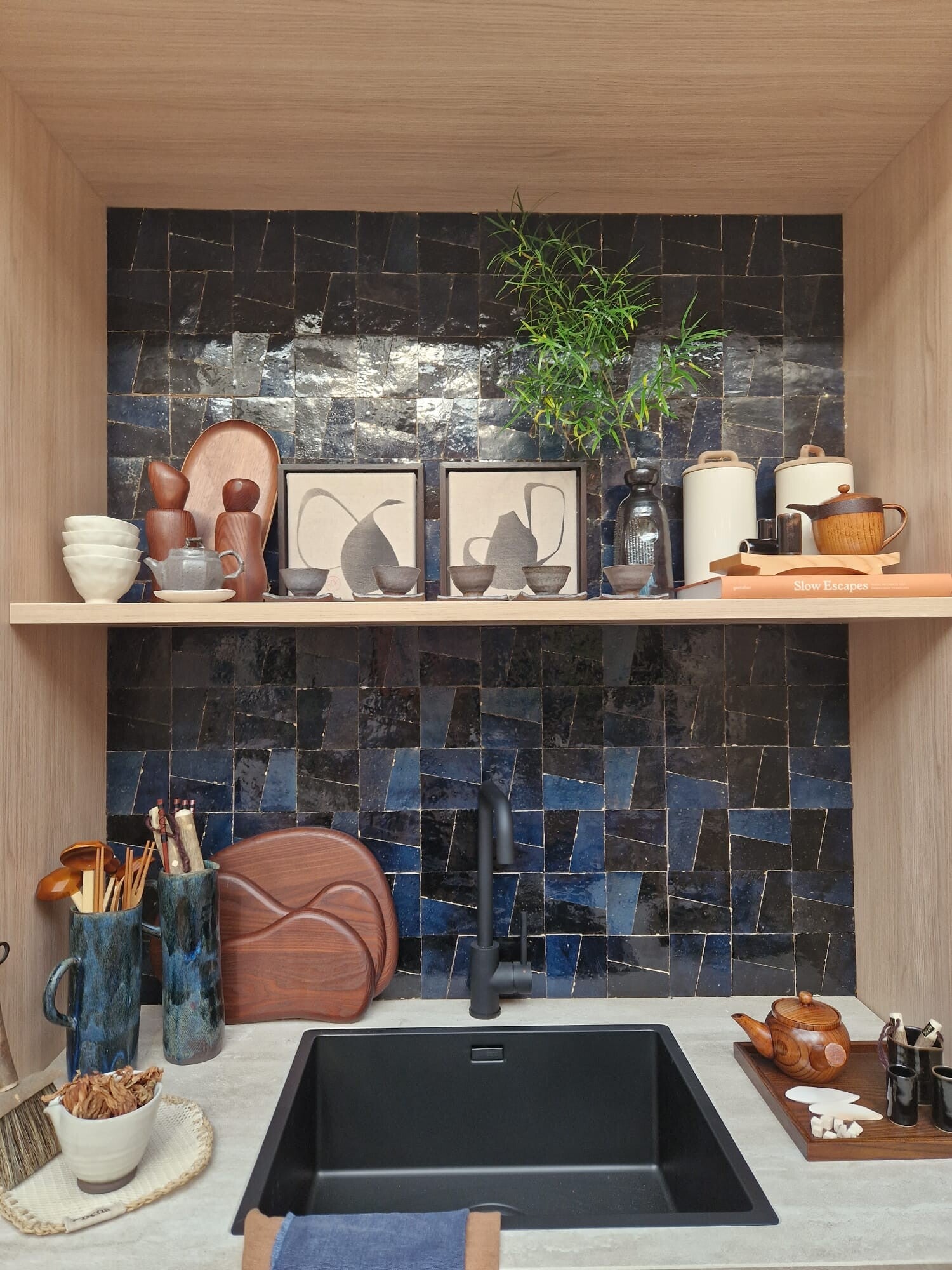 Theepot van hout en bekleed met stof (nunohari techniek) incl. zeefje.