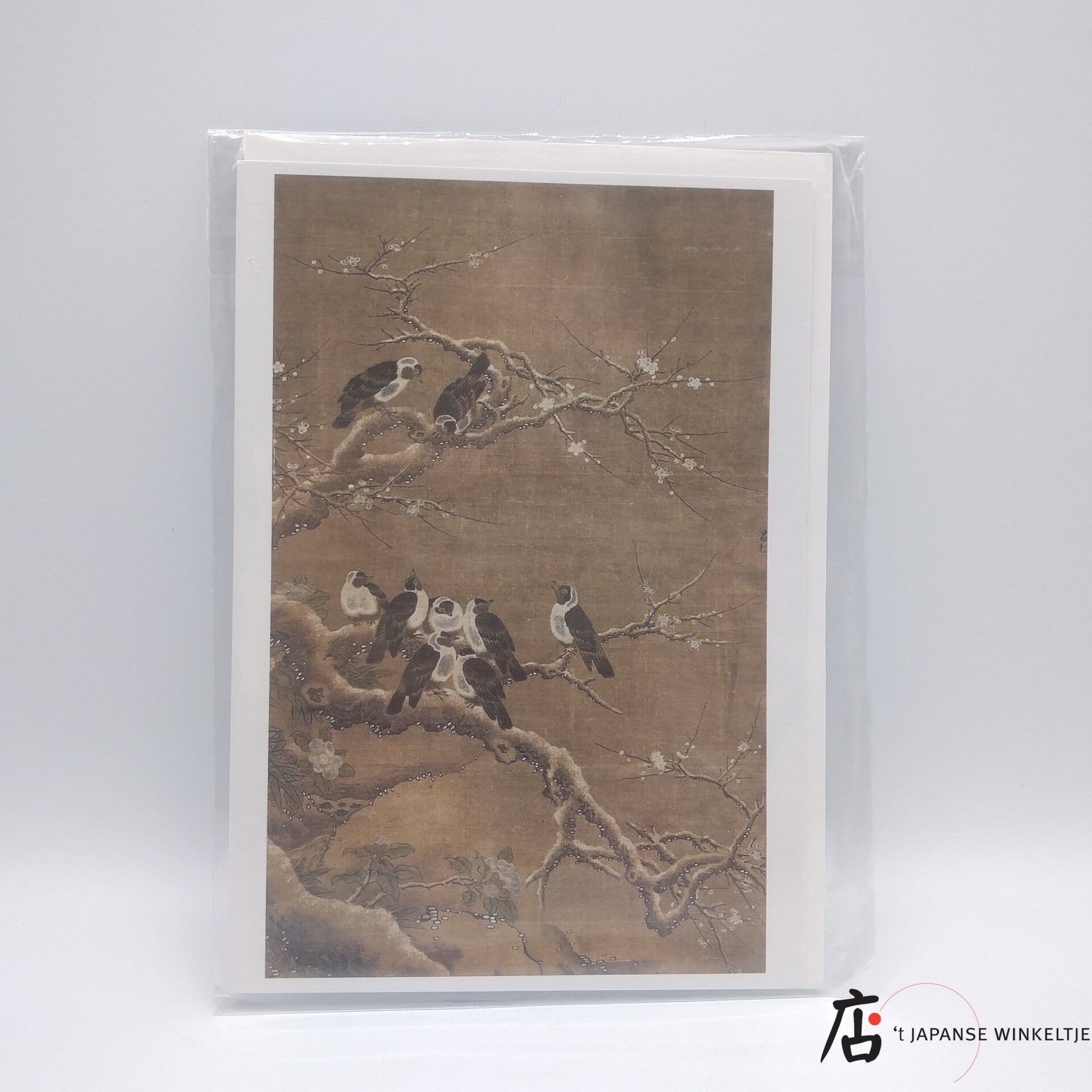 Wenskaart blanco met afbeelding van een prent, getiteld Collared Crows on Winter Prunus van een onbekende Chinese kunstenaar (in de stijl van Lü Ji).