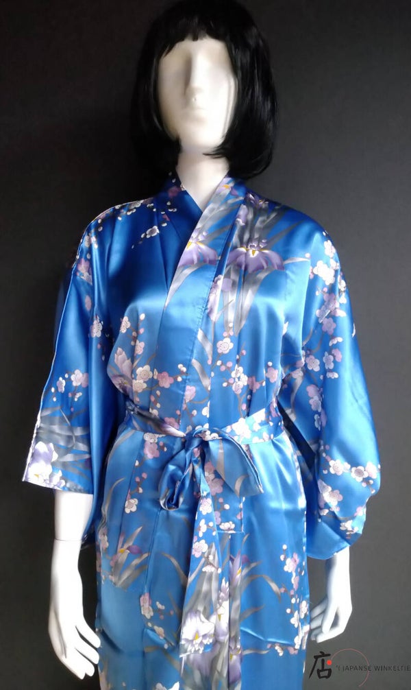 Kimono dames 100% zijde blauw met pruimenbloesems & irissen (T-Yuk-D Zijde Blauw)