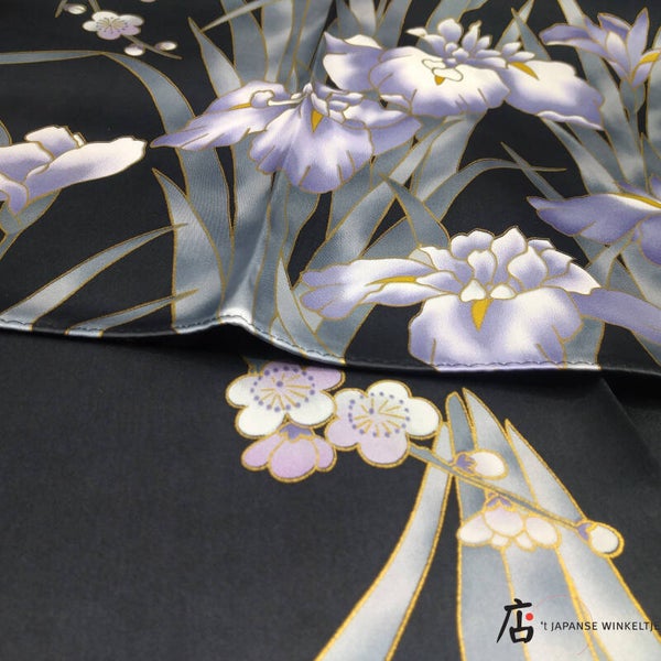 Sjaal van 100% zijde met iris- en pruimenbloesempatroon.Afmetingen: 78 x 78 cmProductcode: T-ST939