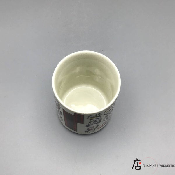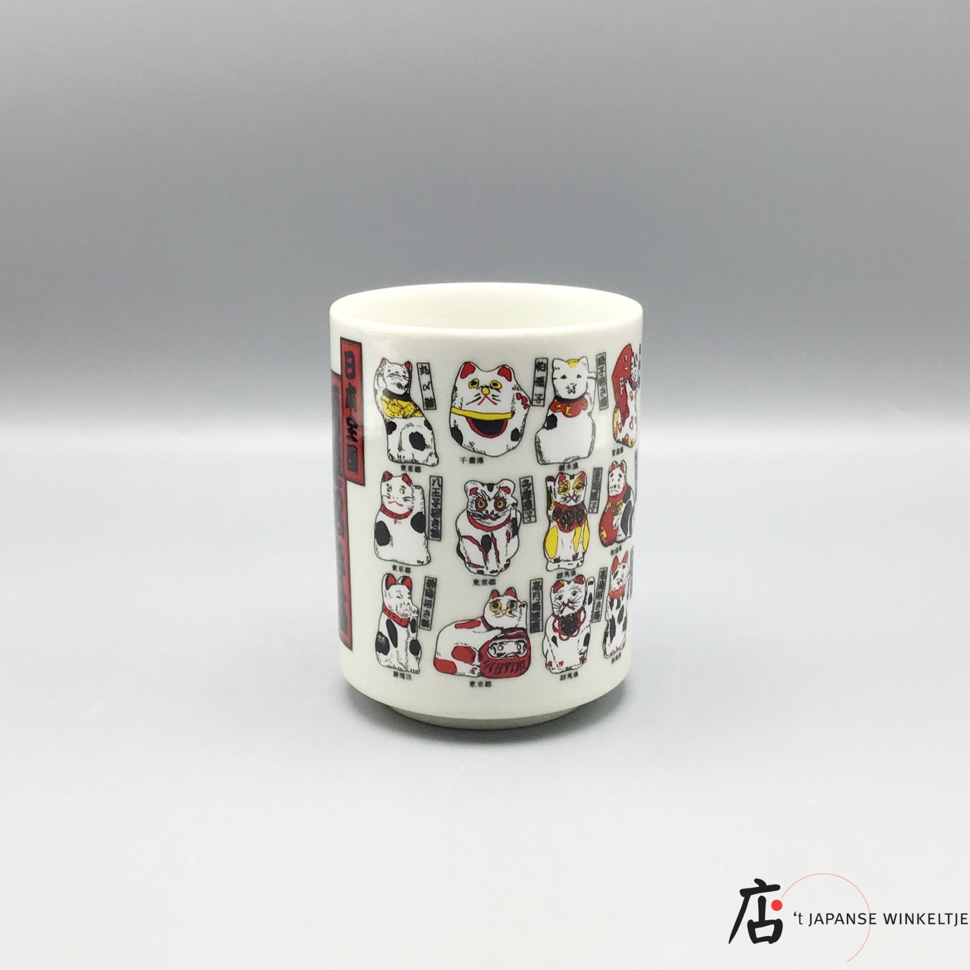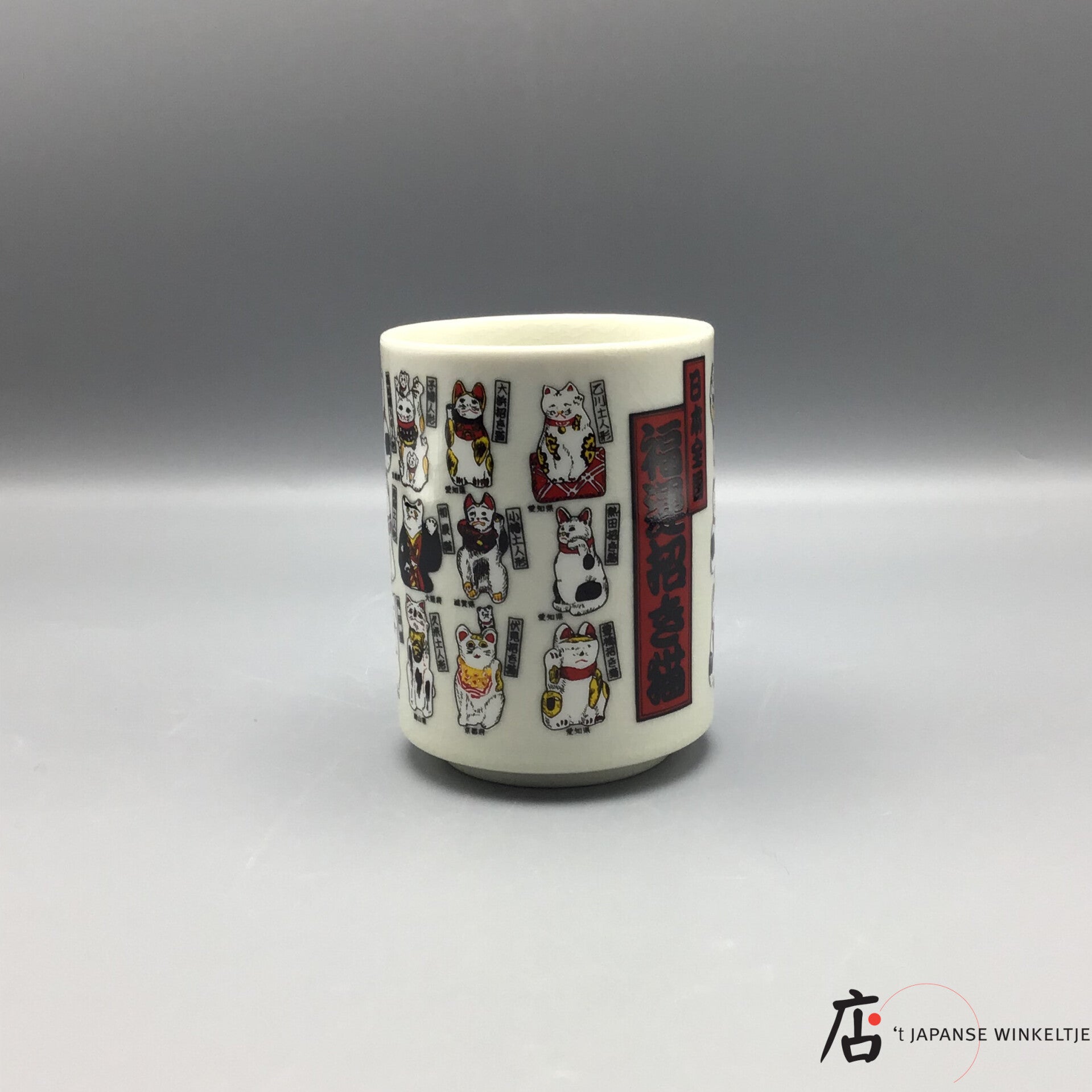 Yunomi / Theebeker wit met Maneki Neko (Kat) patroon Ø 7,5 cm 10 cm hoog (K-Kigu22-10)