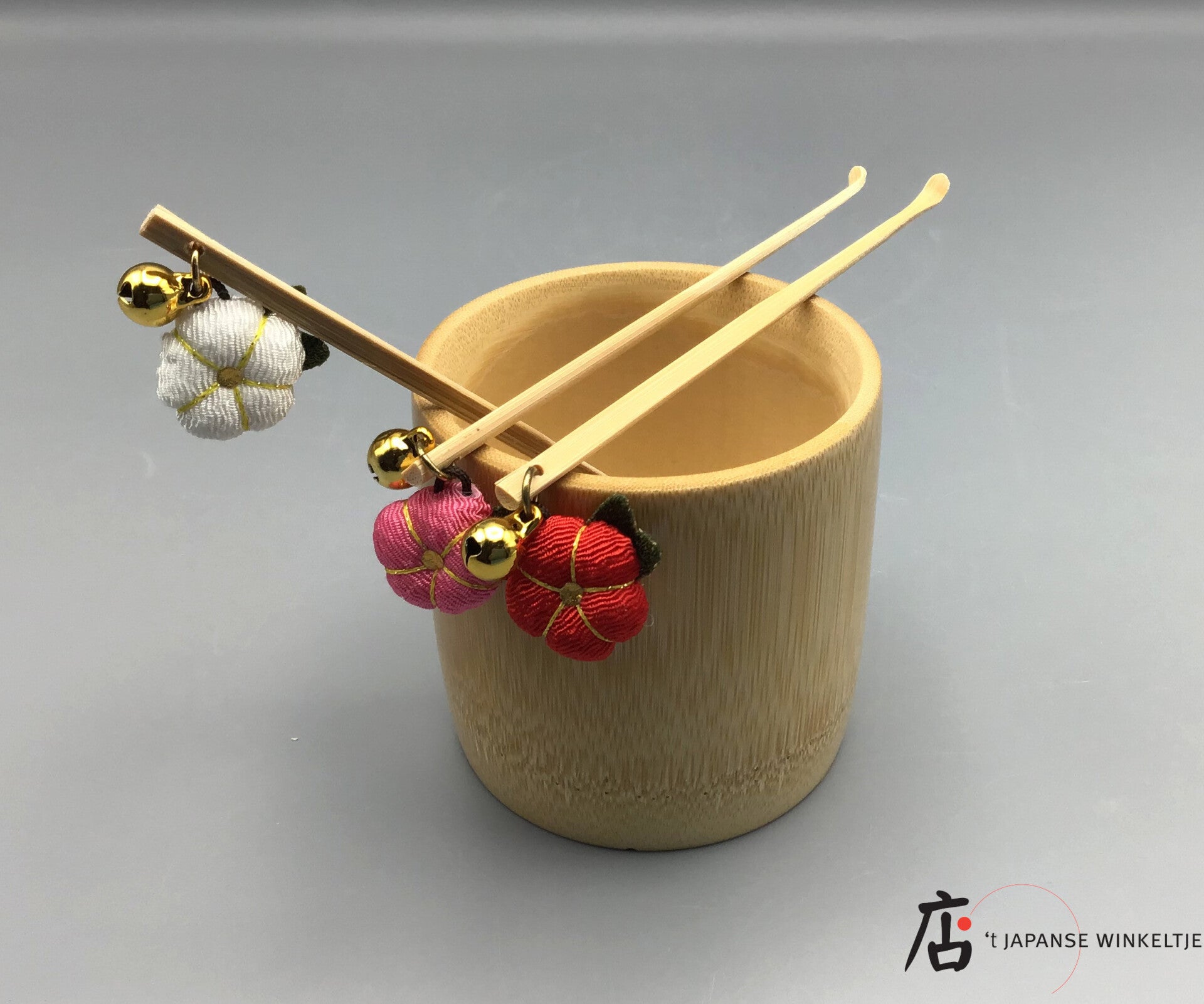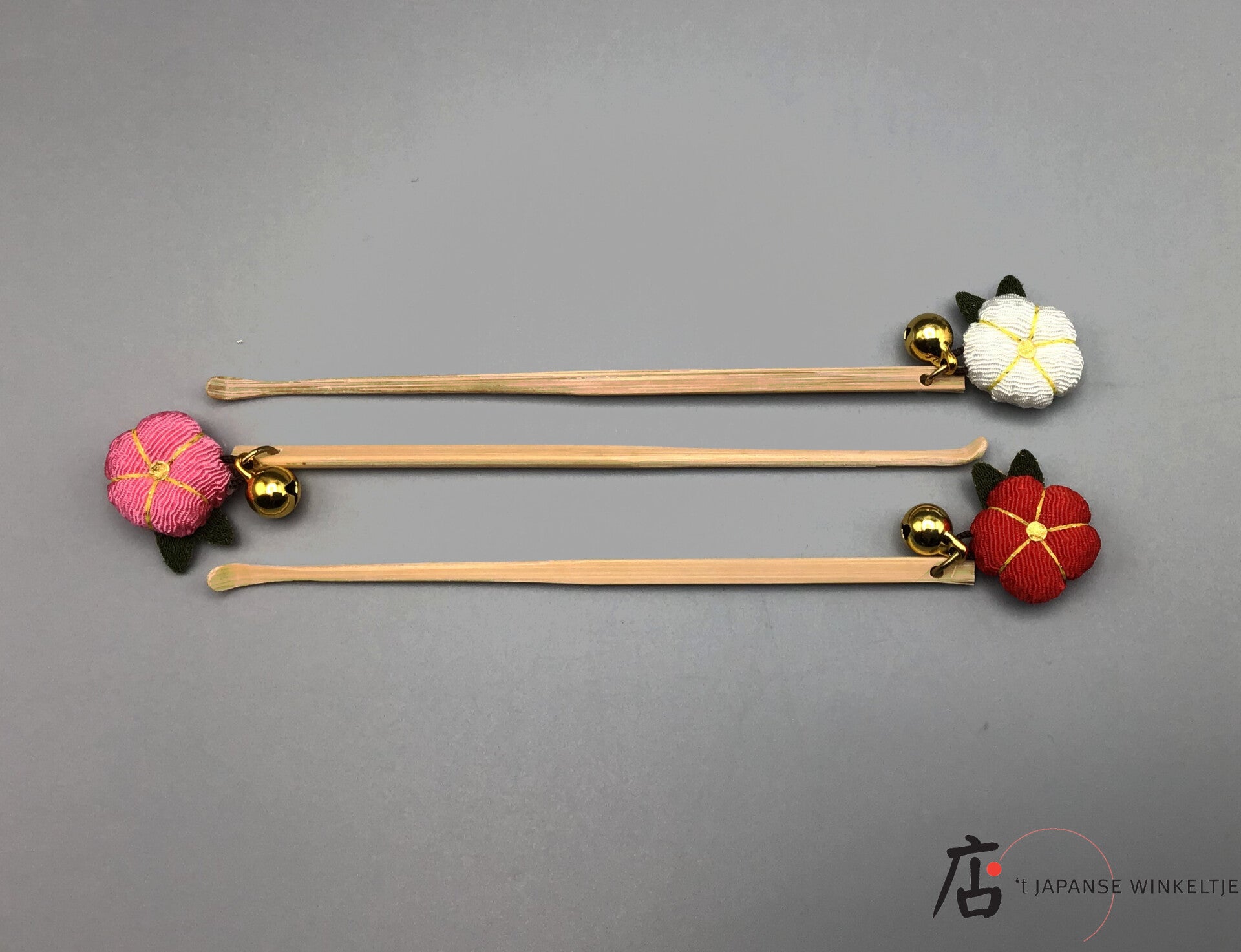 Een sieroorkrabber met een gekleurd bloemetje en een belletje als versiering. Keuze uit wit, lichtroze of rood.