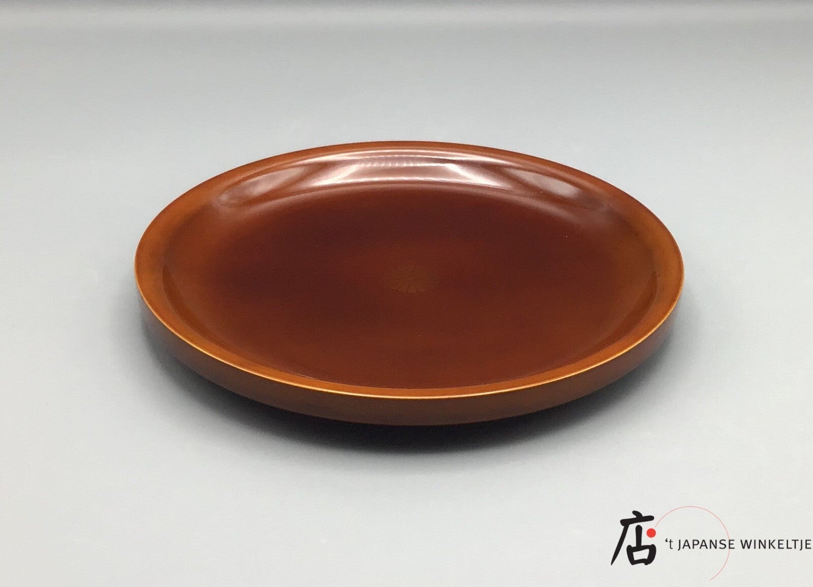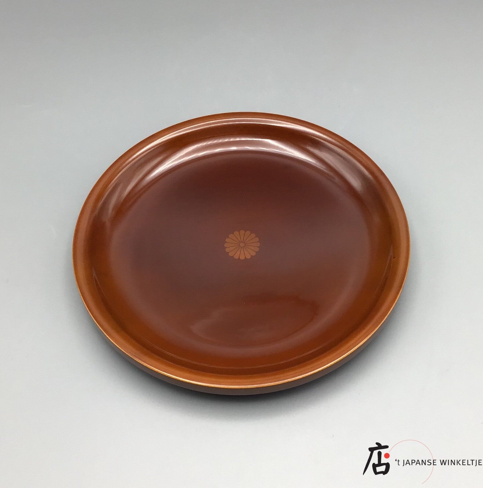 Een dienblad van gelakt hout met een goudkleurige chrysant in het midden.
