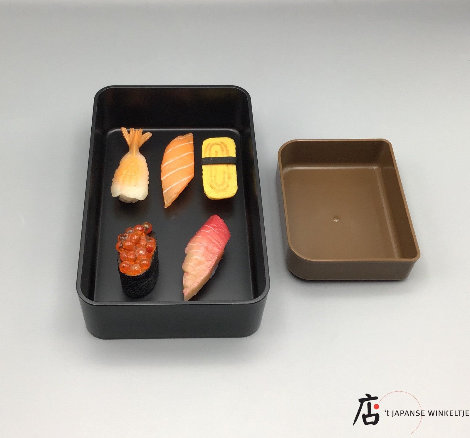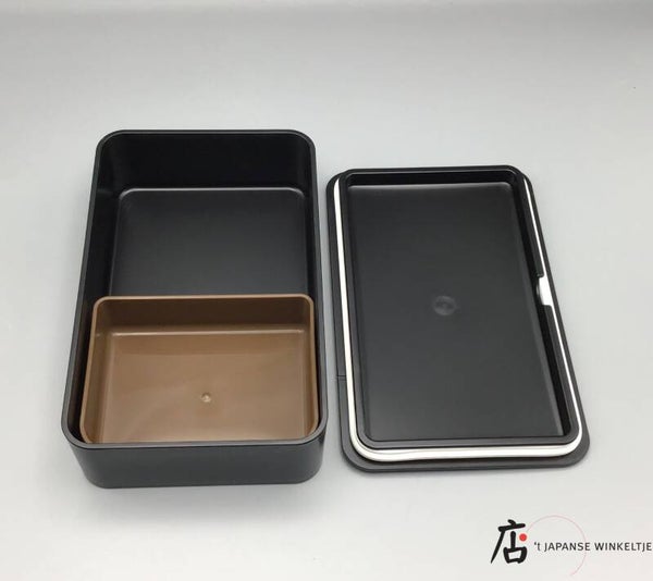 Een bento/lunchbox met een extra compartiment dat verplaatsbaar is. Een zwarte bentoband is inbegrepen.